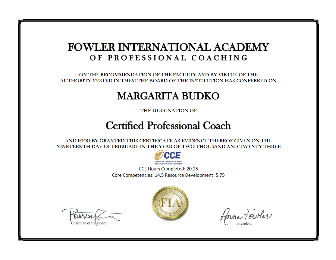 СЕРТИФИКАТ АМЕРИКАНСКОЙ АКАДЕМИИ КОУЧИНГА